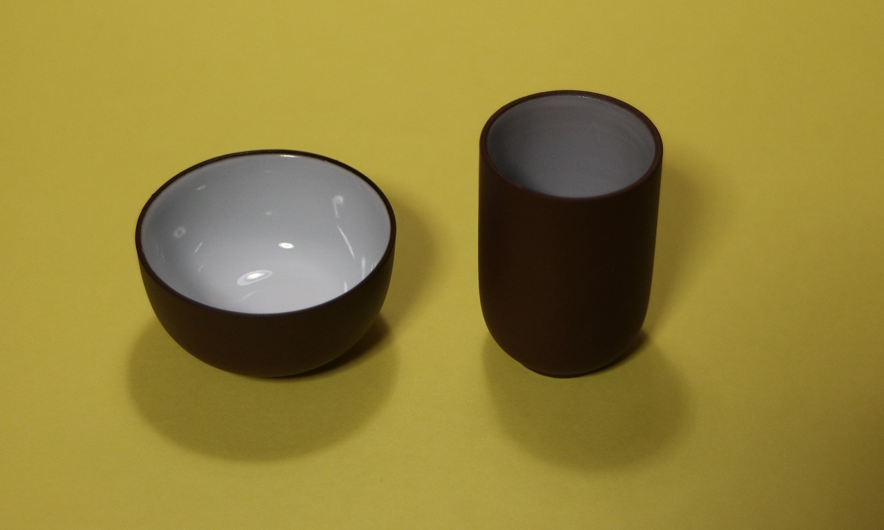 「聞香杯」と「品茗杯」のセットです。宜興紫砂泥製で白釉薬がかけてありますので、茶水の色合いを楽しむことができます。