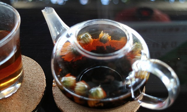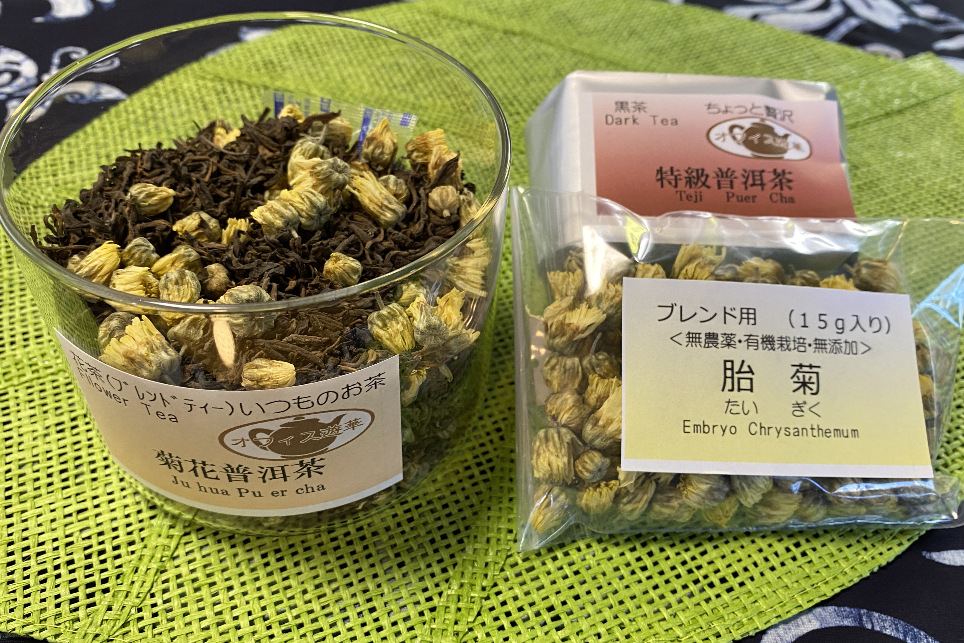 普洱熟茶に「胎菊」(菊花茶用の杭白菊)を加えた、茶舗遊華のオリジナルブレンドティーです。